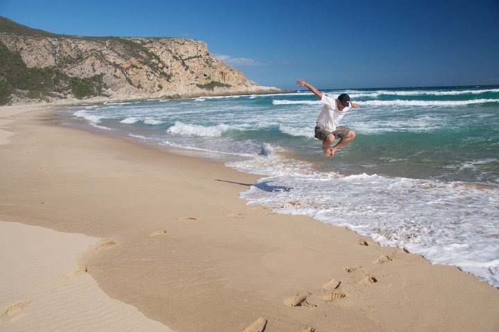 Schadzame po R102 na cesticku Nature Valley cez hory. Je to znama cesta cez krasnu prirodu a este krajsimi vyhladmi. Prichadzame k narodnemu parku Tsisikamma, kde je camp a vyznacenych zopar tur lesom. Bohuzial nestihame vsetko a preto vyberame len kratku turu plazou. Tam riadne fuci a piesok nam robi pieskovy peeling. Priliv vytvoril uzke ramno krizom plazou, ktore musime prebrotit, aby sme sa dostali dalej…. Prechadzky plazou ma nikdy neprestanu bavit.